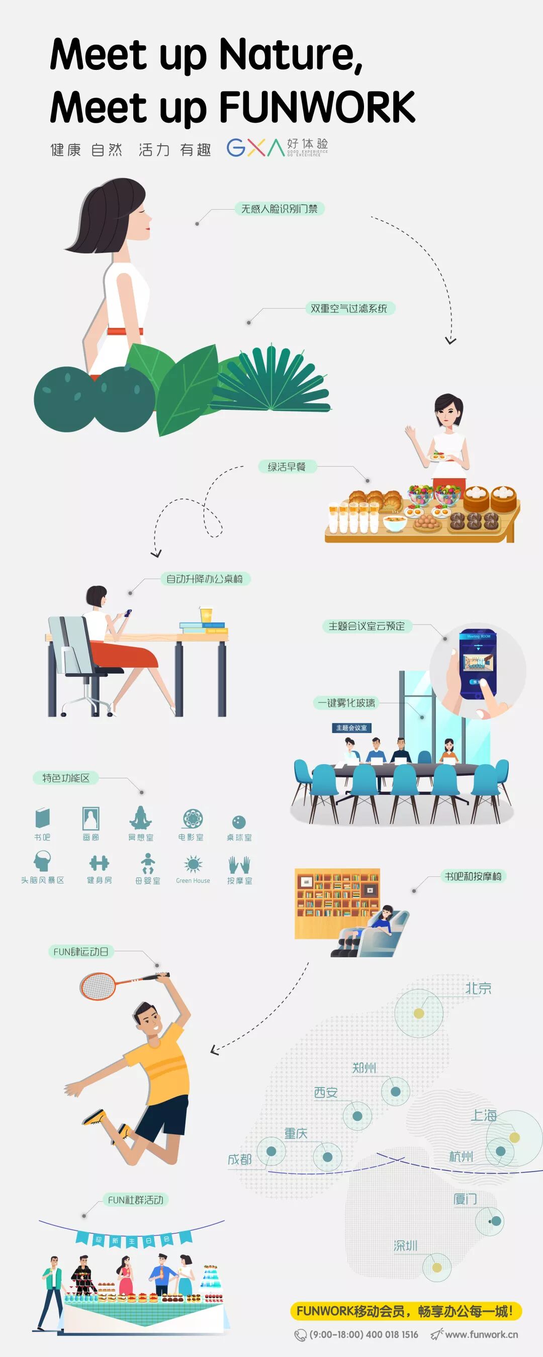 该动画视频全面介绍了在FUNWORK联合办公一天的体验,包含:无感人脸识别、双重空气过滤系统、自动升降办公桌椅、主题会议室云预定、一键雾化玻璃、人性化功能区、全国移动办公等硬件设施,以及绿活早餐、社群活动、运动日等活力有趣的社群服务,全面体现出FUNWORK的愿景和理念。