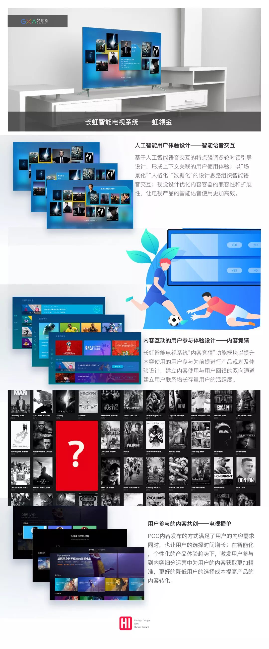 长虹智能电视系统围绕“人工智能体验”,“用户互动参与”,“内容共创”进行了新的虹领金系统4.0的规划和设计;目的在于提升智能电视交互体验的流程性,内容扁平化及语音自由化交互的视觉感知;